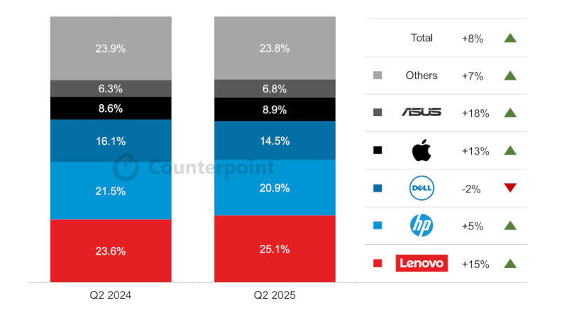 A Lenovo conseguiu mais uma vez fortalecer sua liderança em participação de mercado geral entre os fabricantes de PCs e aumentar a diferença para a segunda colocada, a HP, em vários pontos percentuais, de acordo com estatísticas da Counterpoint Research. De acordo com os resultados do segundo trimestre de 2025, os modelos da Lenovo representaram pouco mais de um quarto de todos os PCs vendidos — a participação da empresa atingiu 25,1%, um aumento em relação aos 23,6% do ano anterior.