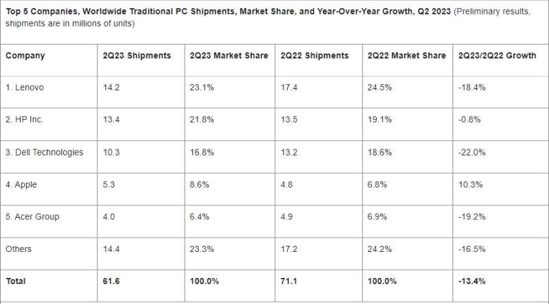 Os resultados preliminares do segundo trimestre permitem que os especialistas da IDC digam que, no período, as vendas de PCs no mercado mundial caíram 13,4%, para 61,6 milhões de unidades, mas ainda assim superaram o esperado. A tendência negativa dominante foi compensada por um aumento de 10,3% nas remessas de produtos da Apple em comparação com o mesmo trimestre do ano passado.