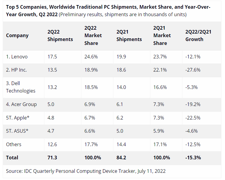 Entre abril e junho, inclusive, aproximadamente 71,3 milhões de computadores foram entregues em todo o mundo. Isso é 15,3% menor que o resultado do segundo trimestre de 2021, quando os embarques foram de 84,2 milhões de unidades.