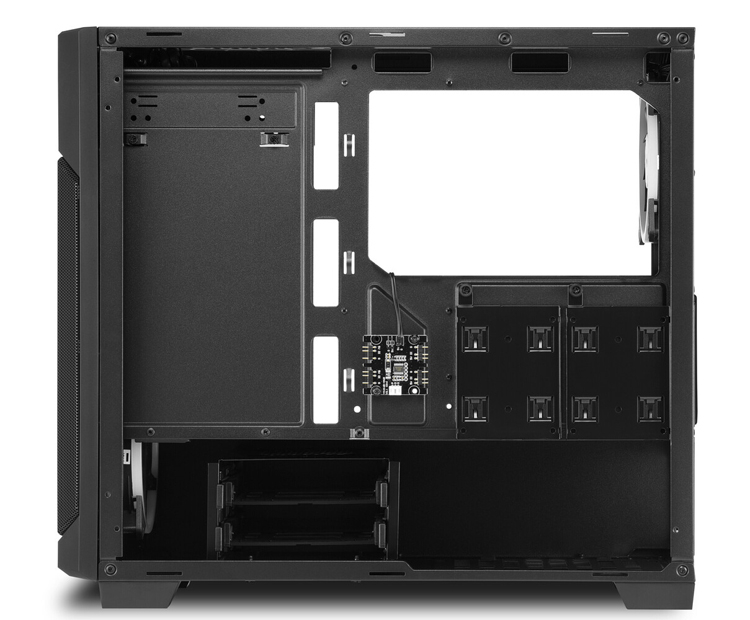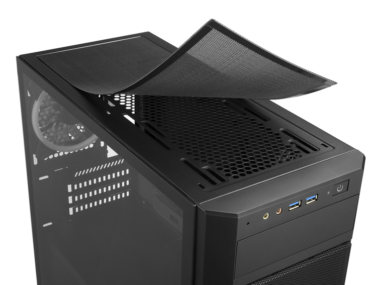 Está disponível um compartimento para um dispositivo de 5,25″. Suporta duas unidades de 3,5″ e seis unidades de 2,5″. Os filtros de poeira removíveis estão localizados na parte superior, frontal e inferior. O bloco de interface na área frontal contém conectores de fone de ouvido e microfone, duas portas USB 3.0.