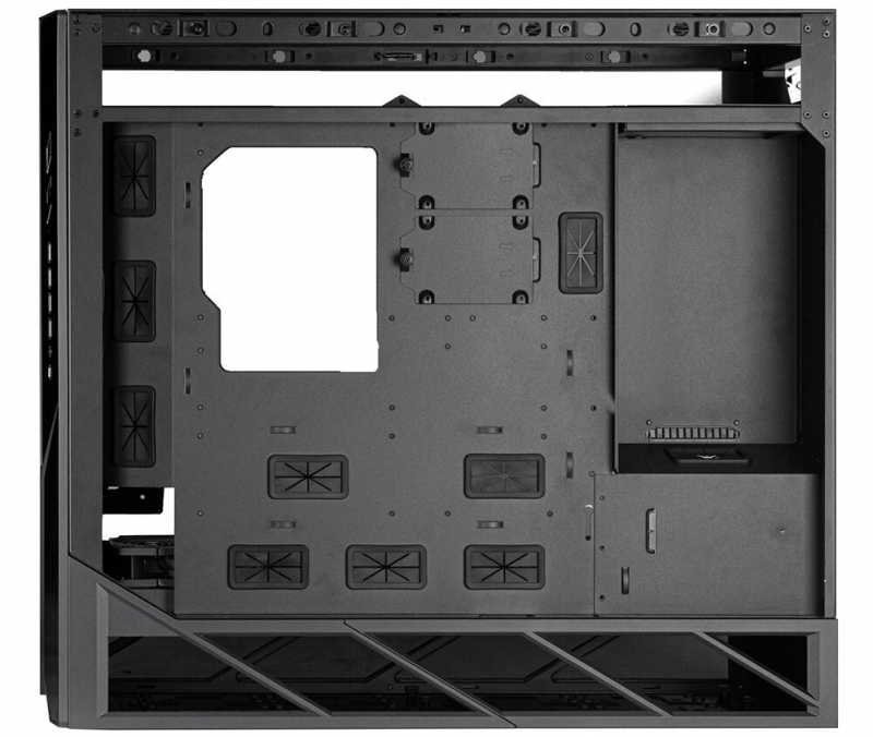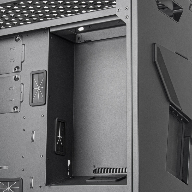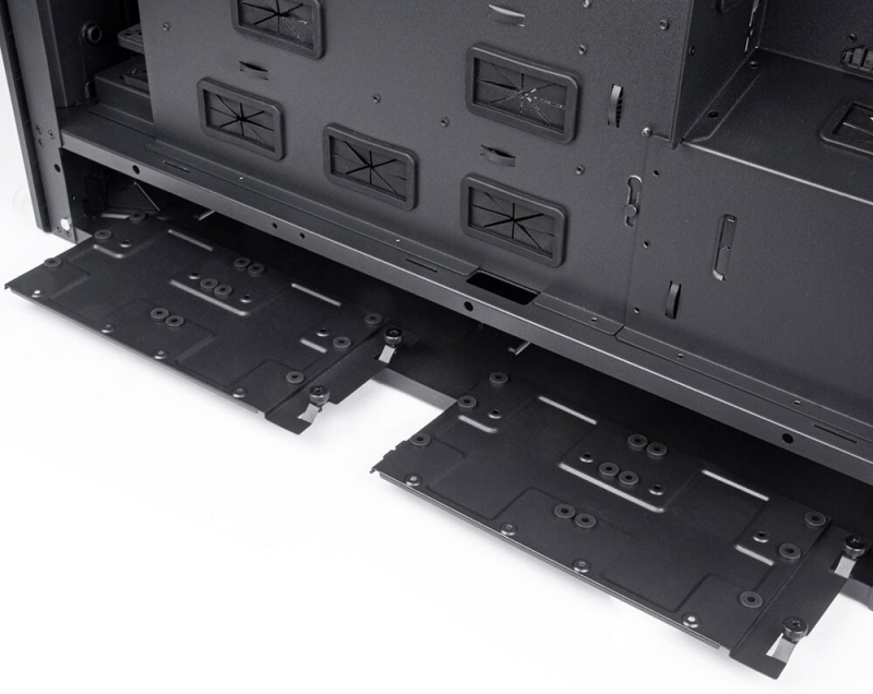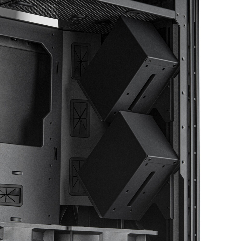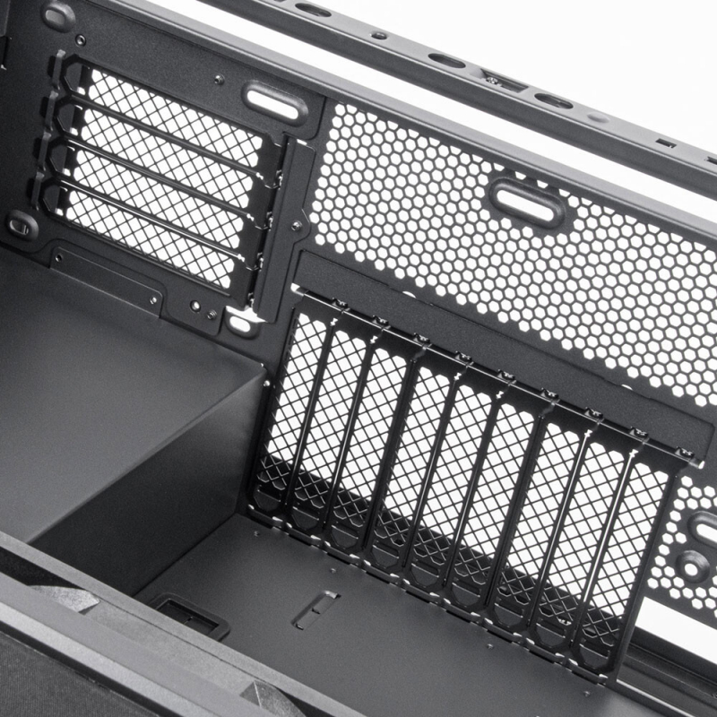 Três assentos adicionais para unidades de 2,5 polegadas estão localizados ao longo da bandeja da placa-mãe. Também na frente do gabinete estão as gaiolas para a instalação de quatro unidades de 3,5 polegadas. No total, o gabinete oferece 17 slots de expansão: nove na bandeja da placa-mãe, quatro em ângulo e mais quatro na parte traseira.