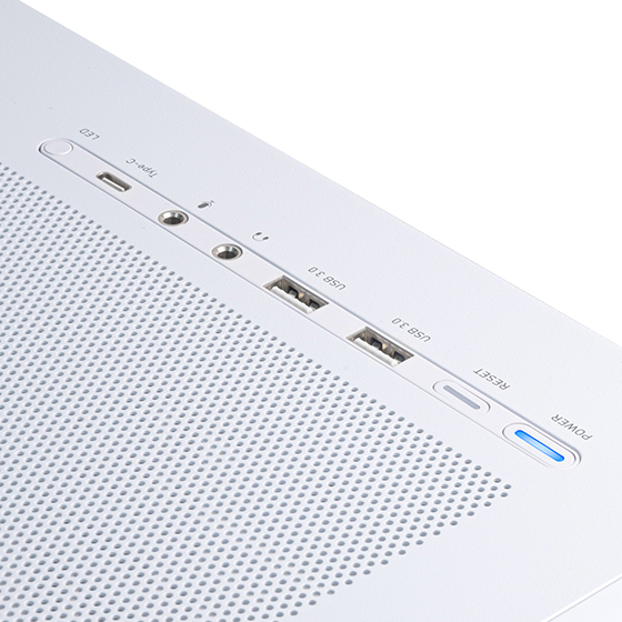 O painel frontal do gabinete é representado por um conector USB Tipo C, dois USB 3.0 x 2, além de um par de saídas de áudio de 3,5 mm.