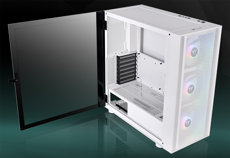 Novos itens são feitos respectivamente em preto e branco. O painel frontal possui design em mesh, o que garante uma boa circulação de ar. Três ventoinhas ARGB Lite de 120 mm com iluminação endereçável multicolorida são inicialmente instaladas na frente: você pode personalizar os efeitos usando a tecnologia ASUS Aura, Gigabyte RGB Fusion, MSI Mystic Light ou ASRock Polychrome. A parede lateral esquerda articulada é feita de vidro temperado de 4 mm de espessura.