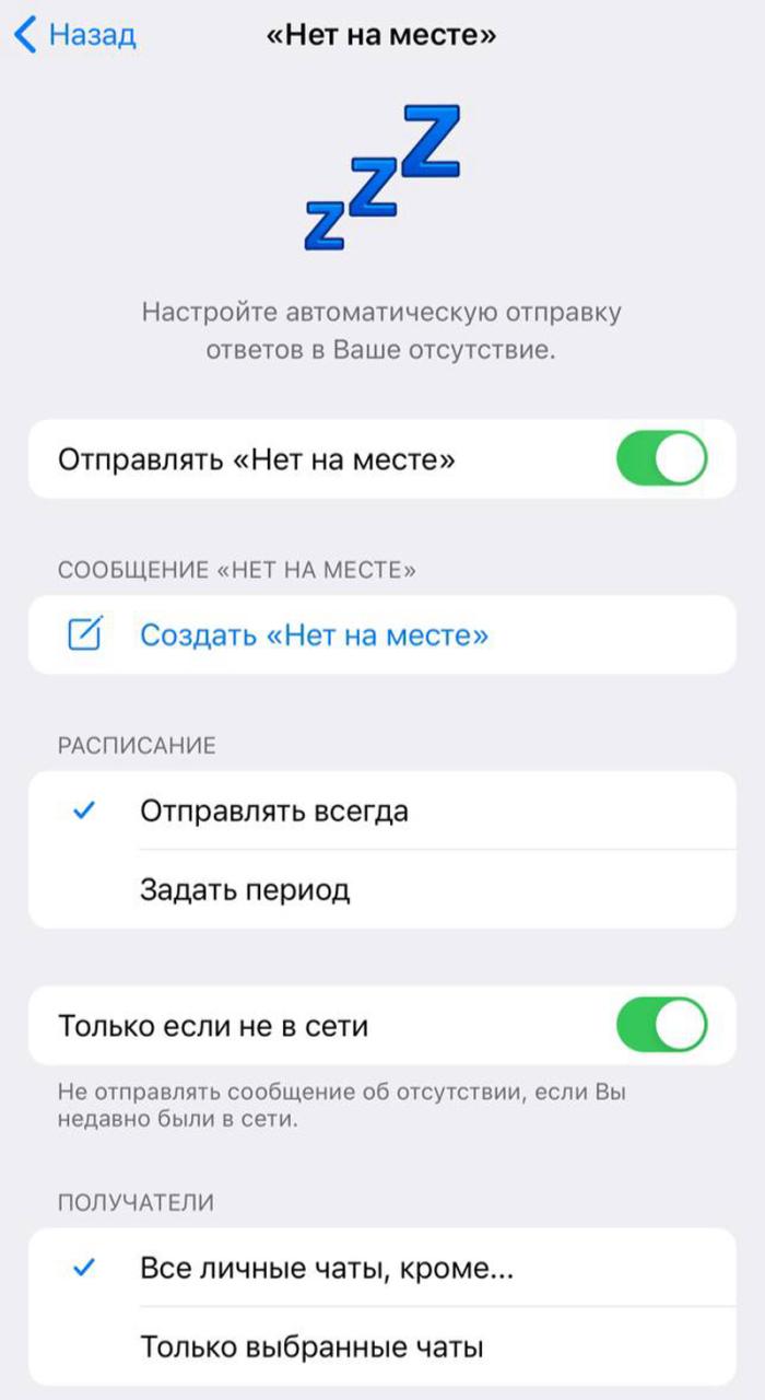 Agora é possível indicar o status “Ausente” caso o usuário não esteja online e configurar respostas automáticas nesse período. Ele pode ser configurado para um período de tempo específico. Você também pode definir a lista de destinatários da mensagem de ausência temporária.