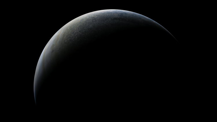 Esta imagem de Júpiter foi criada pelo cientista Kevin M. Gill usando uma compilação de sete fotos tiradas pelo instrumento JunoCam durante a 39ª passagem da sonda ao redor do planeta em 12 de janeiro de 2022. Ao contrário da Lua ou Vênus, o crescente Júpiter é basicamente impossível de ver da Terra devido às peculiaridades das órbitas dos planetas – mesmo com um telescópio, apenas uma superfície completamente iluminada pode ser observada.