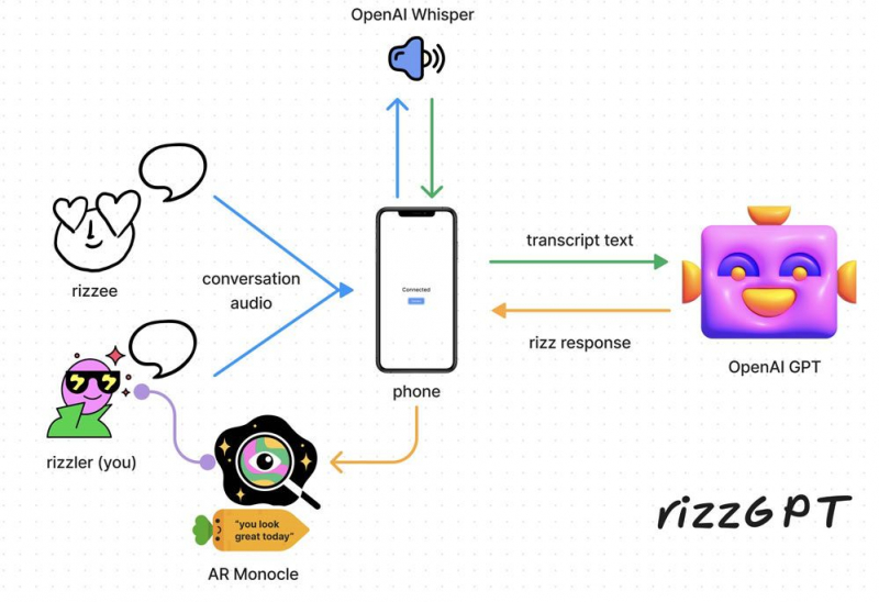 O Monocle, desenvolvido pela Brilliant Labs, é de código aberto, então você pode experimentar seu firmware, que foi o que os criadores do RizzGPT aproveitaram. O monóculo também é equipado com uma câmera, um microfone e uma tela de projeção interna que exibe palavras diante dos olhos do usuário. De acordo com a ideia do autor, quando alguém fala com o usuário, o RizzGPT monitora a conversa pelo microfone, converte em texto e envia para o chat bot ChatGPT AI Wi-Fi da OpenAI para gerar uma resposta. Esta resposta, após um pequeno atraso, aparece na pequena tela do monóculo.