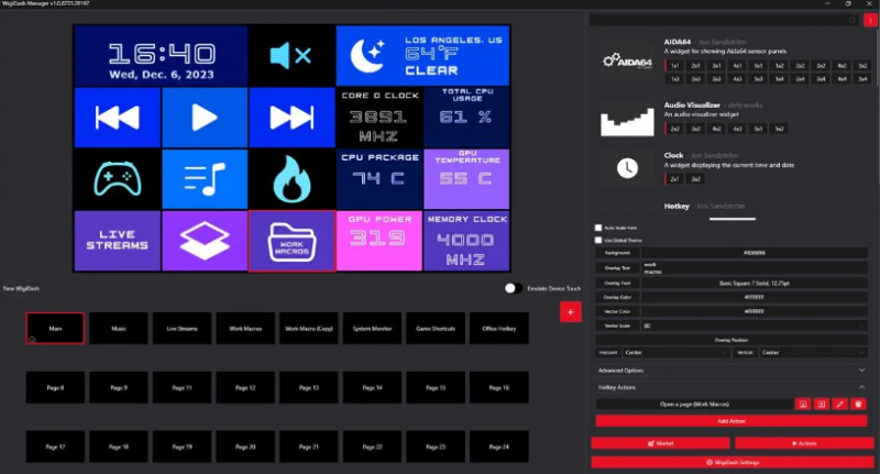 WigiDash foi projetado para agilizar seu fluxo de trabalho e exibir informações do sistema em sua tela sensível ao toque com suporte para teclas de atalho e widgets, tornando-o um painel de comando versátil e adaptável para PCs. As teclas de atalho podem ser configuradas para abrir programas, arquivos, links e iniciar ações no sistema operacional Windows, como controlar a reprodução ou o volume do som. Assim, os atalhos e funções mais utilizados estão disponíveis dependendo das necessidades pessoais do usuário. Eles podem ser configurados para alternar dependendo do aplicativo atualmente em uso.