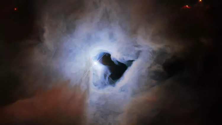 O mais notável é o vazio escuro no coração da nebulosa, com a forma de um buraco de fechadura. Quando o Hubble fotografou a nebulosa pela primeira vez em 1999, acreditava-se que a região central era a chamada. Glóbulo de Bok. Esses glóbulos são nuvens de gás, poeira e outras matérias, tão densas que a luz não pode penetrá-los. Anos de observações consecutivas se passaram antes que se descobrisse que a região escura é literalmente um lugar vazio – ainda não se sabe ao certo por que ela foi formada no meio de uma nebulosa.