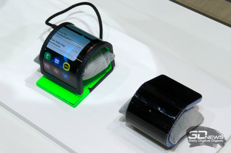 A Samsung tem vasta experiência na produção de telefones, smartwatches e pulseiras fitness, e no projeto Cling Band a fabricante tentou combinar os pontos fortes de todos esses aparelhos. No modo multifuncional, o gadget se parece com um telefone normal, que possui uma série de saliências na contracapa. O dispositivo parece um pouco mais rústico do que um conceito semelhante que a Motorola apresentou na mesma exposição em Barcelona. Na prática, a tela curva acabou ficando longe do ideal – em alguns lugares as dobras do corpo flexível podiam ser sentidas, e uma tentativa de rolar o conteúdo às vezes levava ao seu dimensionamento. Mas a Samsung Cling Band parece incrível e talvez os smartphones de pulso flexíveis possam se tornar uma categoria mais popular de dispositivos de moda do que anéis, óculos e relógios inteligentes.