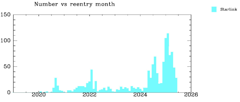 Entre dezembro de 2024 e maio de 2025, a SpaceX desorbitou 472 satélites Starlink. Todos os veículos foram queimados na atmosfera terrestre como parte de um descarte rotineiro de equipamentos obsoletos. Cientistas alertaram para os potenciais riscos ambientais associados a essa desorbitação em massa de satélites.