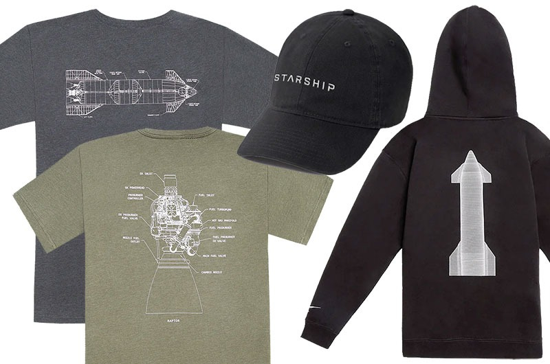 Além dos modelos em escala, a SpaceX começou a vender novas roupas a partir de segunda-feira: camisetas verdes militares e carvão com pequenos logotipos da SpaceX no peito e esquemas de um motor Raptor ou Starship nas costas. Também são apresentados novos moletons cinza e preto com slogans Starship no peito e esboços de naves espaciais nas costas. Há também um boné de beisebol Starship disponível. As roupas estão sendo enviadas para os clientes agora: camisetas custam US$ 30, moletons custam US$ 65 e bonés de beisebol custam US$ 25.