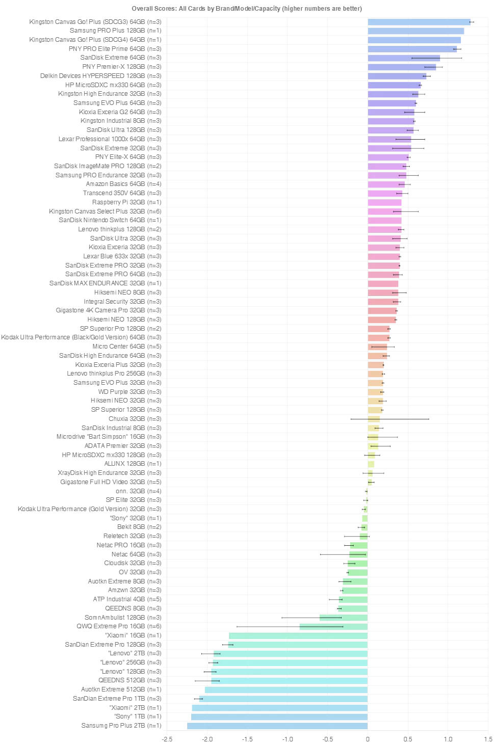 Cartões SD comprados na Amazon apresentaram velocidades médias significativamente maiores, tanto para gravações sequenciais quanto aleatórias. Mesmo cartões originais comprados no AliExpress apresentaram desempenho inferior nesses quesitos. Cole também dividiu os dispositivos em três categorias: falsificações, marcas desconhecidas e produtos originais. Alguns cartões SD desconhecidos demonstraram boa resistência ao desgaste, mas apresentaram desempenho inferior em velocidade e frequentemente continham informações falsas sobre a capacidade. Isso é especialmente importante para cenários profissionais, onde o cartão SD é usado como fonte constante de leitura e gravação: vigilância por vídeo, streaming de vídeo, drones.