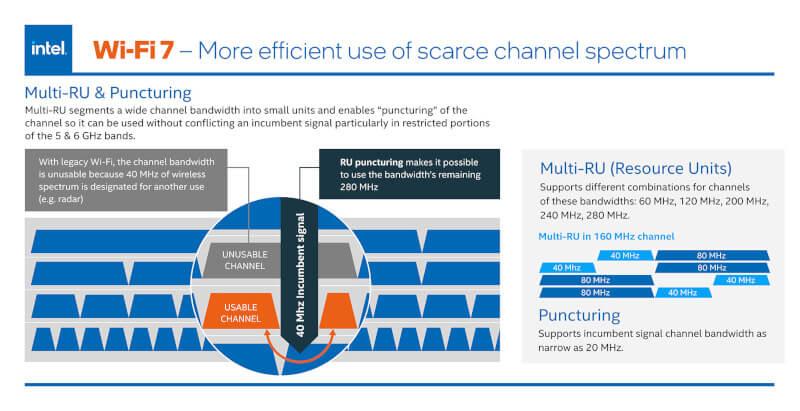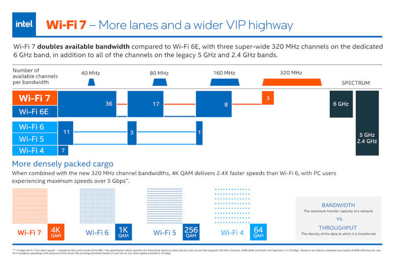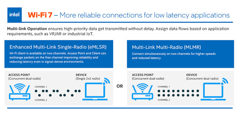 A Intel apresentou os primeiros adaptadores Wi-Fi 7, em particular os modelos Wi-Fi 7 BE200 e Wi-Fi 7 BE202. Ambos os dispositivos operam nas faixas de 2,4 GHz, 5 GHz e 6 GHz, e também possuem interfaces PCIe e USB. No entanto, a velocidade máxima do BE200 é limitada a 5 Gbps, o que é muito menor do que a taxa de transferência máxima declarada do padrão Wi-Fi 7 de 40 Gbps. Embora ainda não tenha sido realizada uma comparação detalhada dos dois modelos, sabe-se que o módulo discreto BE200 passou na pré-certificação Wi-Fi 7.