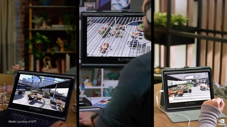 Em sua palestra na conferência NVIDIA GTC, Huang demonstrou como três engenheiros de design e o designer de IA virtual Omniverse Avatar trabalham juntos na Omniverse Cloud para fazer mudanças arquitetônicas. A equipe se comunicou usando uma ferramenta padrão de webconferência enquanto se conectava simultaneamente a uma cena hospedada na Nucleus Cloud. Um designer humano executou o aplicativo Omniverse View em sua estação de trabalho RTX, enquanto outros dois transmitiram o Omniverse View da GeForce NOW para seu laptop e tablet.