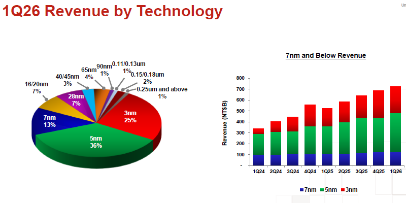 A TSMC há muito tempo gera até três quartos de sua receita com serviços de produção de chips usando padrões avançados de litografia — de 3 a 7 nm, inclusive. No último trimestre, a participação dos produtos de 3 nm na receita da TSMC caiu consistentemente de 28% para 25%, enquanto o processo de 5 nm manteve sua posição no médio prazo, representando 36% da receita total da empresa. O processo de 7 nm está perdendo terreno, com sua participação caindo para 13% tanto em relação ao trimestre anterior quanto em relação ao mesmo período do ano passado, embora por apenas um ponto percentual em cada caso. Independentemente disso, as três gerações de litografia avançada representaram 74% da receita da TSMC no primeiro trimestre.