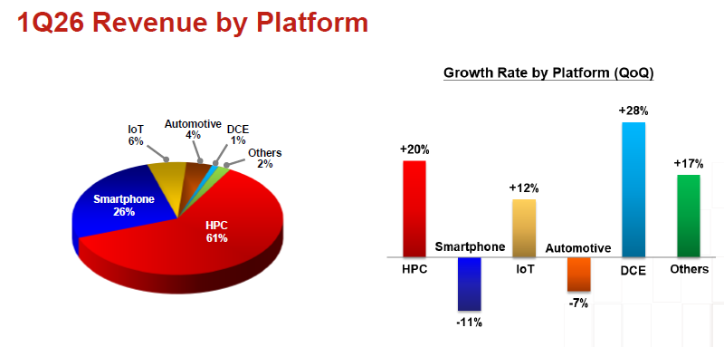 Por segmento de mercado, a computação de alto desempenho (HPC) mantém, previsivelmente, sua liderança, representando 61% da receita total da TSMC, um aumento em relação aos 59% do ano anterior. A participação dos smartphones caiu tanto sequencialmente, de 32% para 26%, quanto em relação ao ano anterior (de 28%), o que pode ser explicado pelo aumento dos preços da memória, reduzindo a demanda por smartphones. Embora a participação da Internet das Coisas (IoT) tenha aumentado de 5% para 6%, o segmento automotivo caiu de 5% para 4%. A eletrônica de consumo, apesar de representar apenas 1% da receita da TSMC no último trimestre, apresentou um aumento consistente de 28% em sua receita principal. O segmento líder de HPC teve um aumento de 20% na receita em comparação com o quarto trimestre do ano passado, enquanto a receita de smartphones caiu 11%. A eletrônica automotiva também apresentou uma queda de 7%, mas o segmento de Internet das Coisas (IoT) cresceu 12%. A TSMC está mais protegida do que seus concorrentes do impacto da crise no mercado de smartphones, pois atende principalmente ao segmento de alto padrão.