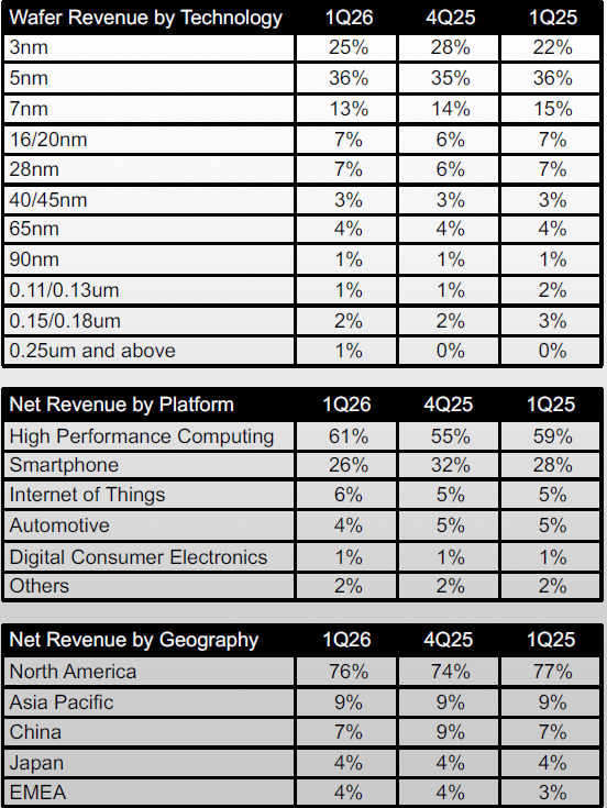 Geograficamente, 76% da receita da TSMC veio da América do Norte, mas não houve mudanças significativas no equilíbrio de poder entre as macrorregiões. A região Ásia-Pacífico manteve-se estável em 9% da receita da TSMC, a China representou 7% e o Japão, 4%, assim como os países da Europa, Oriente Médio e África.