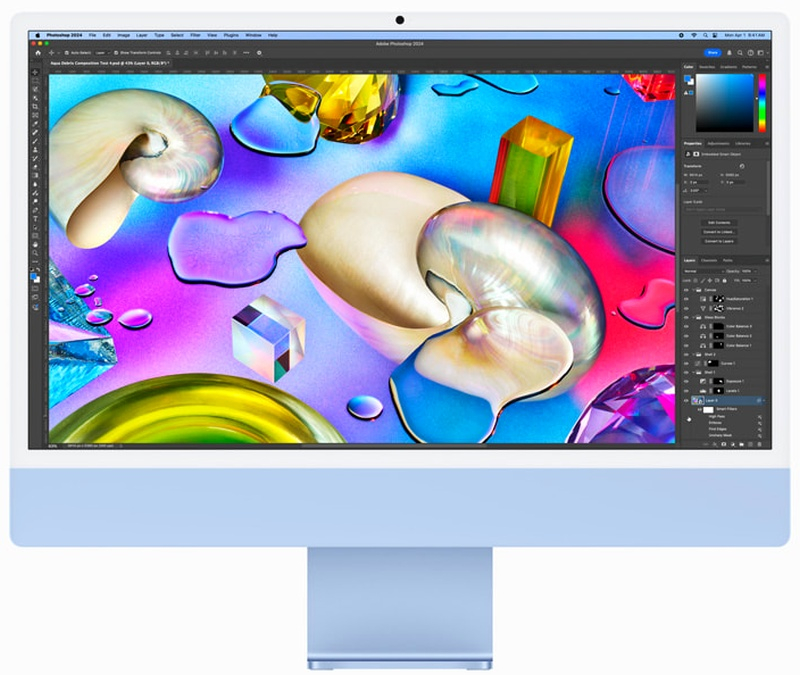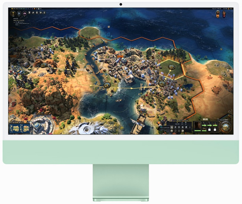 A Apple afirma que o novo iMac é até 1,7 vezes mais rápido para a produtividade diária e até 2,1 vezes mais rápido para fluxos de trabalho exigentes, como edição de fotos e jogos, em comparação com o iMac anterior com chip M1.