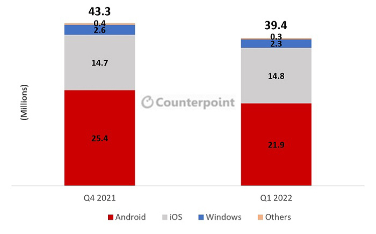 Estima-se que no primeiro trimestre deste ano, os embarques de tablets em escala global somaram 39,4 milhões de peças. Isso é 9% menos do que no último trimestre de 2021, quando os embarques foram de 43,3 milhões de unidades.