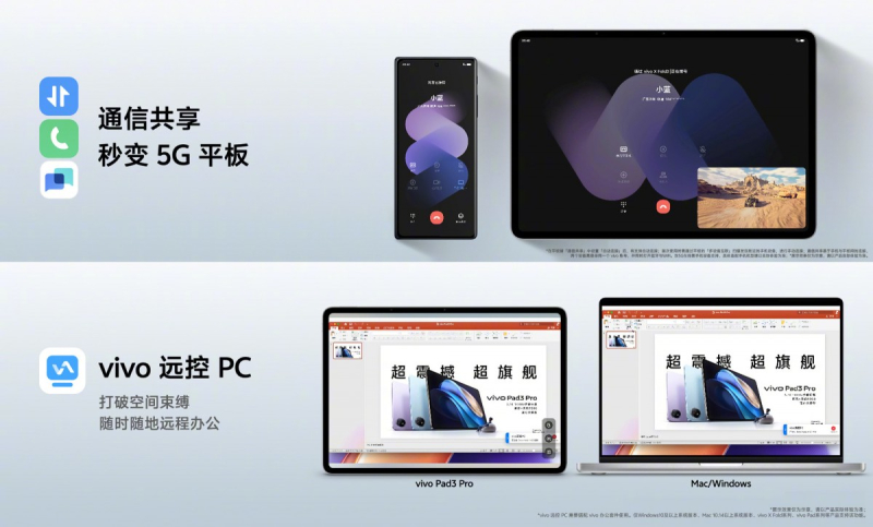 O sistema de refrigeração, que inclui um radiador especial de grafite e uma matriz de resfriamento de cobre, é responsável pela remoção do calor dos componentes do tablet. O Vivo Pad3 Pro também afirma oferecer suporte aos padrões sem fio Wi-Fi 7 e Bluetooth 5.4.