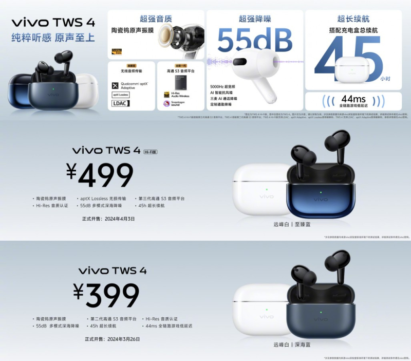 O Vivo TWS 4 será oferecido nas variantes azul e branco e custará 399 yuans (US$ 55). A versão Hi-Fi do Vivo TWS 4 custa 499 yuans (US$ 70). Ambas as mesas estarão à venda na China a partir de 3 de abril.