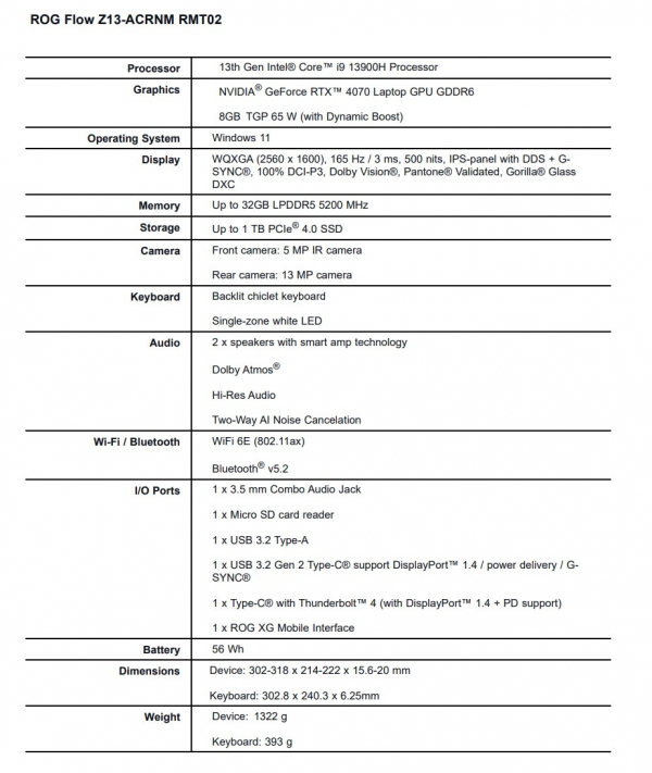 O tablet para jogos ROG Flow Z13-ACRNM RMT02 é alimentado por um processador Intel Core i9-13900H de 14 núcleos de até 5,4 GHz. O dispositivo pode oferecer até 32 GB de RAM LPDDR5-5200, além de um SSD PCIe 4.0 de até 1 TB. A placa de vídeo aqui é discreta – GeForce RTX 4070 com 8 GB de memória GDDR6, mas com TDP reduzido para 65 W (incluindo Dynamic Boost).