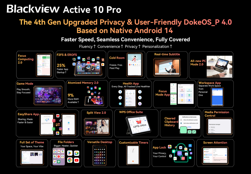 A resistência do Active 10 Pro à umidade, poeira e choques é confirmada pela certificação de acordo com os padrões MIL-STD-810H, IP68 e IP69K, que permite sua utilização em qualquer clima sem medo de falhas e garante um funcionamento confiável mesmo em temperaturas extremas. O Active 10 Pro é executado no Doke OS 4.0 atualizado baseado no sistema operacional Android 14.