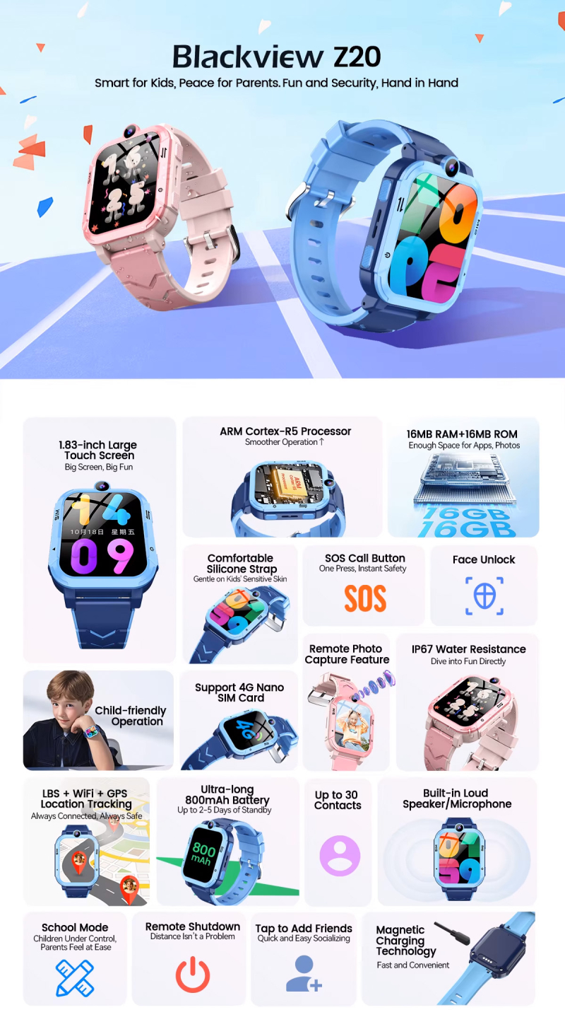 Além do Active 10 Pro, a Blackview apresentou no dia 9 de dezembro o smartwatch infantil Blackview Z20 com capacidade de rastrear localização por GPS e posicionamento LBS, além de suporte para chamadas e fotografia, o que permite que os pais tenham sempre informações sobre a localização exata. de seu filho e manter contato com ele.
