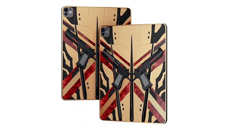 Para dar ao tablet uma aparência brutal, os canos das pistolas são “perfurados” com lâminas afiadas de titânio. As pistolas são emolduradas com incrustações de ouro 24 quilates, contrastando com inserções de titânio PVD preto fosco comumente usadas em relógios suíços de luxo.