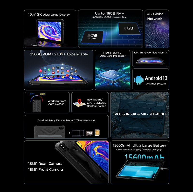 O tablet HOTWAV R6 Ultra pode ser levado em caminhadas, recreação ao ar livre ou viagens, tendo a certeza de que o dispositivo está protegido de forma confiável contra possíveis danos, pois é fabricado de acordo com os padrões IP68, IP69K, MIL-STD-810H. Além disso, o tablet pode operar em temperaturas de -30 a +60 ºC.