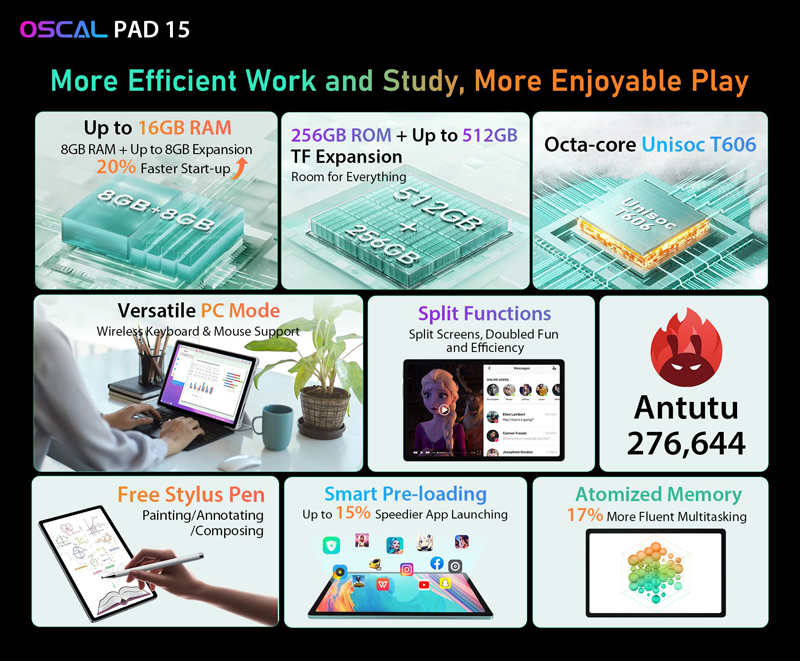 O tablet Oscal Pad 15 é baseado em um chip Unisoc T606 de oito núcleos com freqüência de clock de até 1,6 GHz e um acelerador gráfico Mali-G57 MP1, que garante operação de alto desempenho do dispositivo ao executar aplicativos que consomem muitos recursos e pesados jogos, bem como no modo multitarefa. O aparelho possui 8 GB de RAM LPDDR4 com possibilidade de expansão de software em 6 GB. DokeOS P 3.0 baseado no Android 13 apresenta a chamada memória atômica, permitindo que você execute mais aplicativos em segundo plano, aumentando a eficiência da RAM e multitarefa até 17% mais suave.