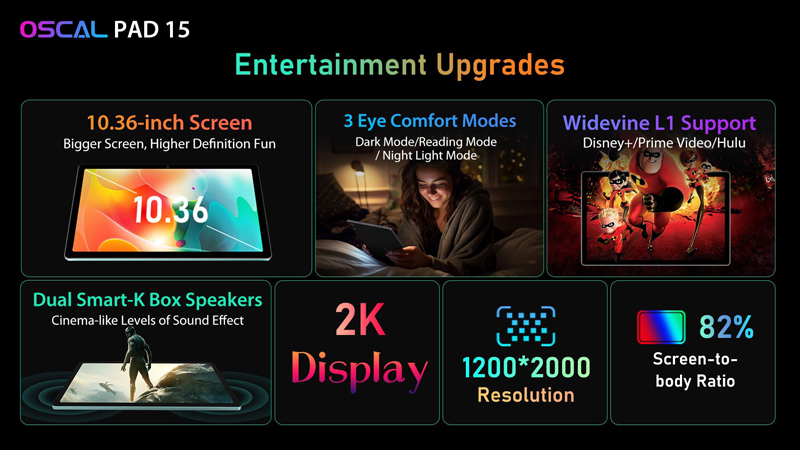 Oscal Pad 15 possui uma grande tela de 10,36 polegadas com resolução 2K, ideal para streaming e jogos. Com suporte para Widevine L1, o tablet permite transmitir vídeo Full HD (1080p) em plataformas como Hulu, Amazon Prime Video e Disney+. Os tablets vêm com uma caneta para entrada manual de dados.
