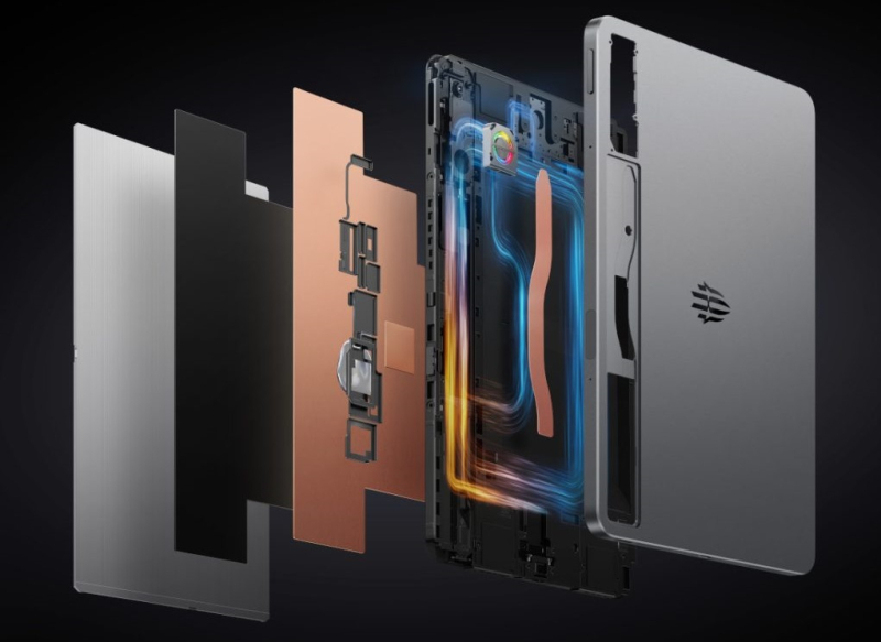 Assim como o smartphone RedMagic 9S Pro, o Gaming Tablet Pro está equipado com um sistema de refrigeração ativo. Além do ventilador, inclui um grande tubo de calor de cobre. Tudo é feito para garantir que a versão líder do Snapdragon 8 Gen 3 não superaqueça sob carga.
