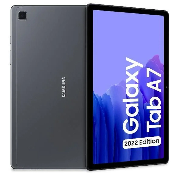 O tablet Samsung Galaxy Tab A7 (2022) é mostrado em cores cinza, mas outras opções estarão à venda. A novidade será oferecida com o sistema operacional Android 11 (provavelmente com uma atualização posterior para o Android 12). O preço rondará os 200€.