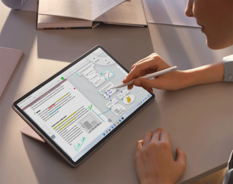 O ecrã tátil diagonal de 12,35 polegadas tem uma resolução de 2,5K e uma taxa de atualização de 120Hz. Você pode interagir com a tela usando uma caneta especial, que permite fazer anotações manuscritas, anotações, desenhar, etc. O equipamento inclui uma câmera frontal de 8 megapixels e uma câmera traseira com sensor de 13 megapixels.
