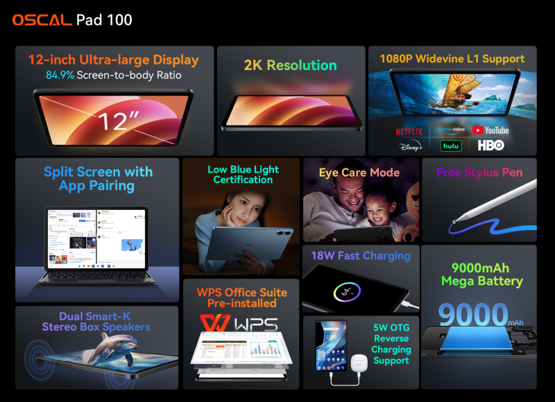 O OSCAL Pad 100 é equipado com uma tela IPS de 12 polegadas com resolução de 2000 × 1200 pixels, taxa de atualização de 60 Hz e suporte para 16,7 milhões de tons de cor. O ajuste inteligente de brilho por IA otimiza automaticamente o brilho da tela com base na luz ambiente, reduzindo o cansaço visual durante o uso prolongado. O tablet foi certificado por ter baixos níveis de luz azul, prejudicial aos olhos.