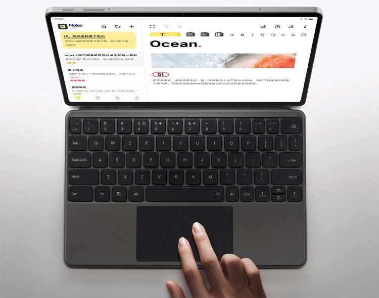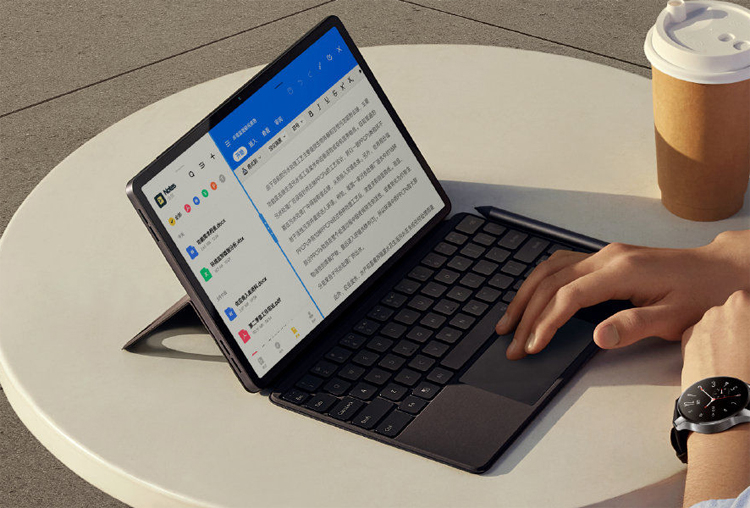 Uma porta USB tipo C, botões de controle físico laterais e um sistema de áudio de quatro alto-falantes são mencionados. Os usuários poderão interagir com o tablet usando uma caneta especial, e um teclado adicional permitirá que o dispositivo seja usado como um laptop compacto.