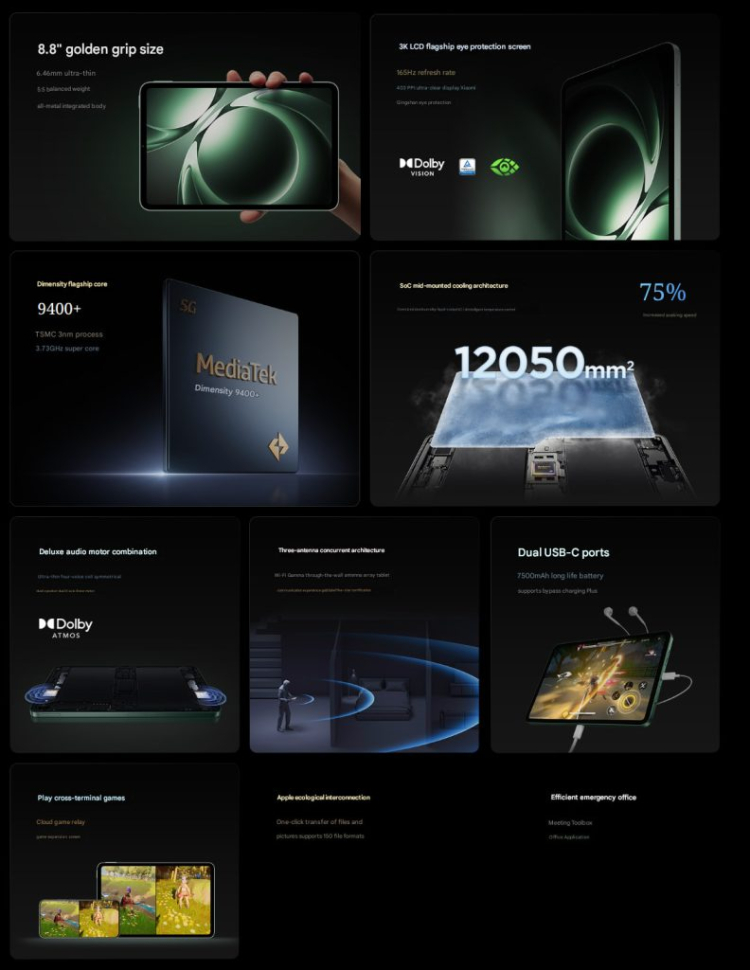 As dimensões do dispositivo são 205,13 × 132,03 × 6,46 mm e o peso é de 326 g. O tablet possui uma bateria de 7500 mAh, um sistema de alto-falantes estéreo com suporte para Dolby Atmos, Wi-Fi 7 e Bluetooth 5.4, além de portas USB Tipo-C 3.2 Gen1 e USB 2.0. O pacote inclui um carregador de 67 W. O sistema operacional utilizado é o Android 15 com o shell proprietário HyperOS 2.