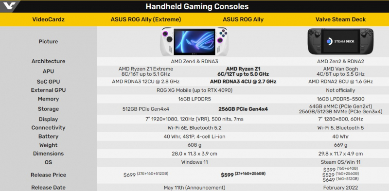 Os jornalistas referem-se aos dados de dois informantes da rede, que, aparentemente, os receberam do banco de dados da varejista americana BestBuy, parceira oficial da ASUS, na qual o console estará disponível no dia do início das vendas. Anteriormente, da mesma fonte, soube-se que a versão do console com um processador Ryzen Z1 Extreme de oito núcleos e um SSD de 512 GB custará US $ 699,99 no início das vendas, o que o torna US $ 50 mais caro que o Steam máximo Versão do deck, que é oferecida por US$ 650 no mesmo volume de SSD. A opção de console de 256 GB da Valve custa US$ 530. Assim, o ROG Ally na mesma configuração, segundo o último vazamento, custará US$ 170 a mais.