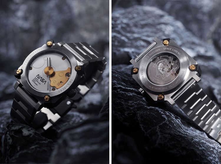 O relógio possui uma pulseira de aço inoxidável 316, o mostrador é gravado com o logotipo da NASA e a frente é adornada com From Sapiens to Ludens, o lema da Kojima Productions. Opcionalmente, você pode encomendar um relógio com pulseira de couro com padrão de fibra de carbono. A parte de trás do relógio é transparente, feita de cristal de safira, através do qual é visível o mecanismo de corda automática Miyota 8215.