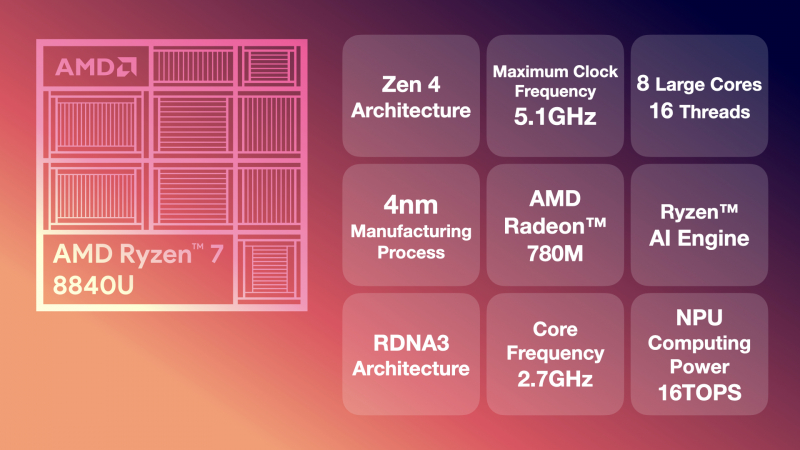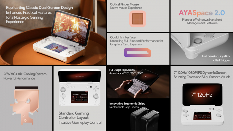 Os consoles AyaNeo Flip DS e Flip KB são semelhantes entre si em seu formato dobrável, telas de 7 polegadas com taxa de atualização de 120 Hz e processadores. Os dispositivos serão produzidos tanto com base no chip móvel Ryzen 7 7840U quanto no mais recente Ryzen 7 8840U. Ambos os processadores possuem oito núcleos Zen 4 com 16 threads e velocidades de até 5,1 GHz, além de 16 MB de cache L3 e uma GPU Radeon 780M integrada com 12 unidades de execução. O chip mais recente apresenta um mecanismo neural XDNA mais poderoso. Ambos os processadores possuem um TDP de 28 W. Os consoles receberam sistemas de refrigeração com câmara de evaporação e um ventilador.
