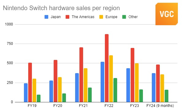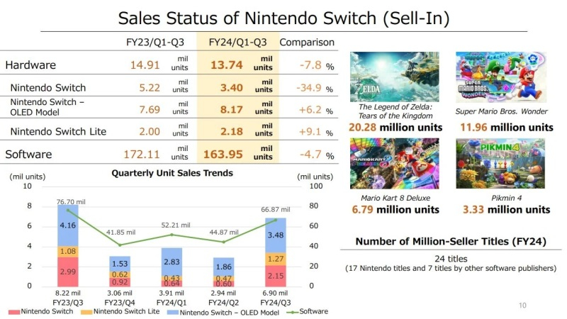 Quanto aos jogos Switch, The Legend of Zelda: Tears of the Kingdom vendeu 780 mil cópias no trimestre, e o jogo vendeu 20,28 milhões de cópias desde o lançamento. O recém-lançado Super Mario Bros. Wonder já vendeu 11,96 milhões de cópias, enquanto Super Mario RPG vendeu 3,14 milhões de cópias. O jogo Switch mais vendido continua sendo Mario Kart 8 Deluxe, com 60,58 milhões de cópias vendidas.