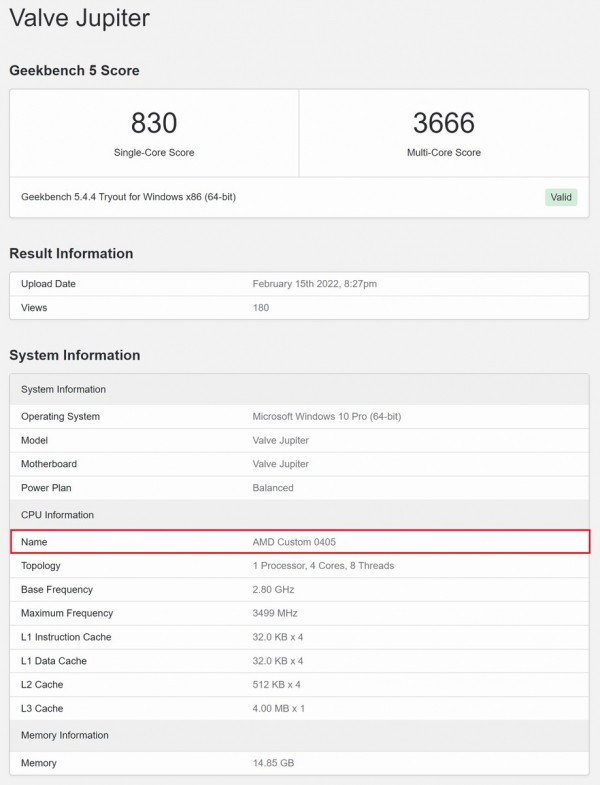 No banco de dados do benchmark sintético Geekbench 5, há uma nova entrada sobre o teste do console portátil Steam Deck, onde ele aparece sob o codinome Valve Jupiter.