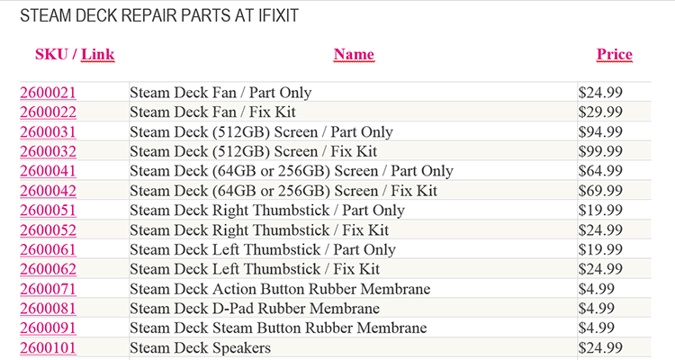A iFixit pretende vender quase todas as peças para a reparação da consola de jogos Steam Deck. A lista de componentes para o Steam Deck, que estará à venda na primeira fase, inclui 23 itens, incluindo uma placa-mãe AMD APU.