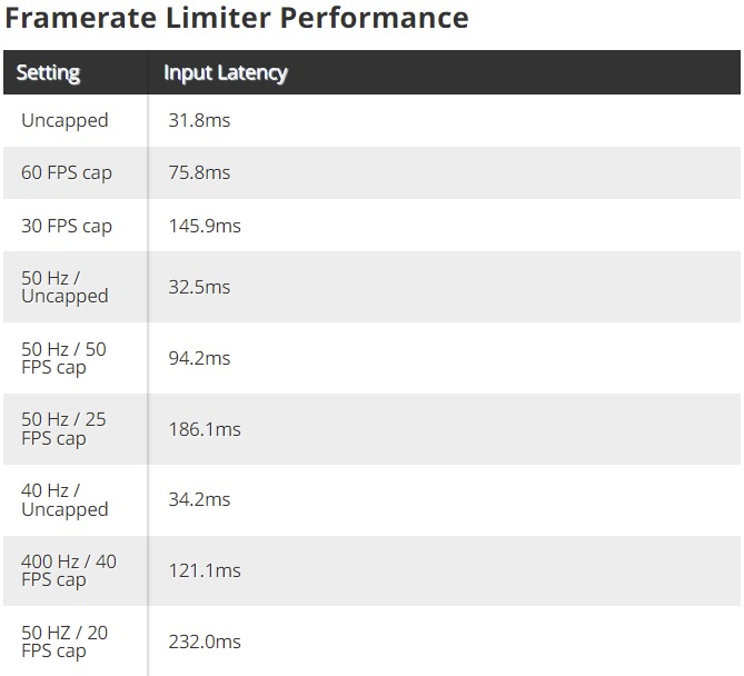 O tempo de atraso de entrada aumenta proporcionalmente de acordo com o limite da taxa de quadros e a taxa de atualização da tela do console. Por exemplo, sem limite de taxa de quadros, o nível de latência é de 31,8 ms. Se você definir um limite de 30 quadros por segundo diretamente no próprio console, o atraso no jogo aumentará quatro vezes – até 145,9 ms. De acordo com as observações, a pior latência é observada em 40 Hz e 20 quadros por segundo. Nesse caso, a latência aumenta para 232 ms, que é mais de 7 vezes maior do que quando a taxa de quadros e a taxa de atualização não são limitadas. O efeito menos negativo no aumento da latência é observado ao definir a taxa de atualização para 50 ou 40 Hz. Neste caso, o atraso aumenta apenas em 8% do original.