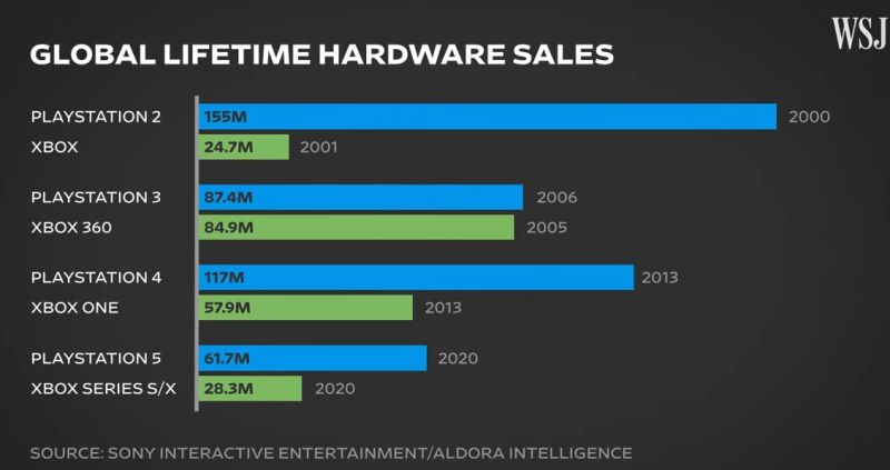 Os dados correspondentes apareceram em uma reportagem em vídeo do The Wall Street Journal dedicada aos consoles de jogos modernos. As estatísticas que combinam relatórios da Sony e dados da Aldora Intelligence demonstram uma superioridade mais do que dupla da solução atual da Sony sobre a plataforma de jogos concorrente da Microsoft. Aliás, esta lacuna nem sempre foi assim se olharmos para as gerações anteriores de consolas de jogos das duas empresas. Enquanto o PlayStation 4 era quase exatamente duas vezes mais popular que o Xbox One, com 117 milhões de unidades vendidas, o PlayStation 3, com 87,4 milhões de unidades, estava apenas ligeiramente à frente do Xbox 360.