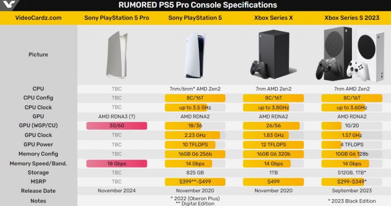 Há rumores de que o PS5 Pro usará o novo SoC da AMD com o codinome “Viola”. Consiste em 30 unidades WGP (WorkGroup Processors) ou clusters de núcleos gráficos na terminologia do fabricante. Essas 30 unidades WGP contêm 60 unidades de execução gráfica (Compute Units, CU). Para efeito de comparação, o processador do modelo atual do PlayStation 5 possui 36 unidades de execução. Também é relatado que a memória da GPU do decodificador atualizado funcionará a uma velocidade de 18 Gb / s por pino, que é 4 Gb / s a mais que o modelo PS5 atual. Infelizmente, ainda não há informações sobre a quantidade de memória de vídeo e dados sobre a largura do barramento de memória do novo console. A GPU do set-top box também terá suporte de hardware para rastreamento de raios.
