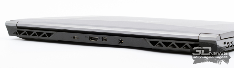 A localização dos conectores no corpo do Cyberbook indica indiretamente que o dispositivo foi desenvolvido pelo fabricante como um substituto para um desktop doméstico. Por outro lado, estamos perante um modelo fácil de levar numa viagem ou para o trabalho. Assim, na parte traseira do gabinete há saídas de vídeo HDMI e mini-DisplayPort, um conector para conectar uma fonte de alimentação e uma porta USB 3.2 Gen2 tipo C. Com sua ajuda (após adquirir uma docking station), a funcionalidade do CyberLine C150i-003 pode ser aumentada ainda mais. Aumentar significativamente.