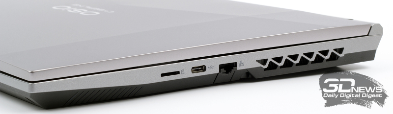 Curiosamente, a porta Ethernet do controlador Realtek gigabit não está localizada na parte traseira, mas na lateral. Lá (no lado direito) há outro USB 3.2 Gen2 tipo C e um slot para cartões microSD. No lado esquerdo do laptop estão USB 2.0 e USB 3.2 Gen1 tipo A e um par de conectores de 3,5 mm para conectar um fone de ouvido.