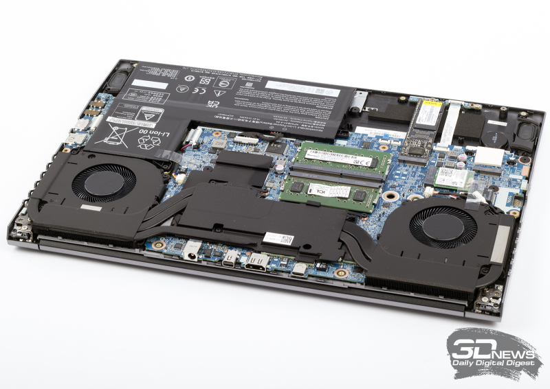 O sistema de refrigeração dos principais componentes do laptop consiste em cinco tubos de calor, um par de ventoinhas e quatro radiadores de cobre. O ar é expelido por trás e pelas laterais. Ao mesmo tempo, o processador central Core i5-12600H e os gráficos GeForce RTX 4060 possuem resfriamento parcialmente comum – dois tubos de calor são conectados a ambos os chips.